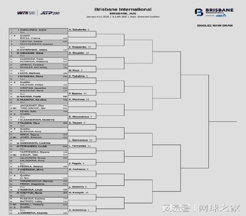 WTA500布里斯班站則是星光熠熠,多位TOP10球員出戰(zhàn)。前八大種子的對(duì)位:上半?yún)^(qū),薩巴倫卡--凱斯、萊巴金娜--亞歷山德洛娃;下半?yún)^(qū),陶森--佩古拉、米拉-安德列娃--阿尼西莫娃。雙打方面:中國有四朵金花出戰(zhàn),其中張帥/薩姆索諾娃首輪迎戰(zhàn)巴多薩/薩巴倫卡;蔣欣玗/詹皓晴對(duì)陣亞歷山德洛娃/米拉-安德列娃;謝淑薇/奧斯塔彭科迎戰(zhàn)蓋德基/米哈利科娃。