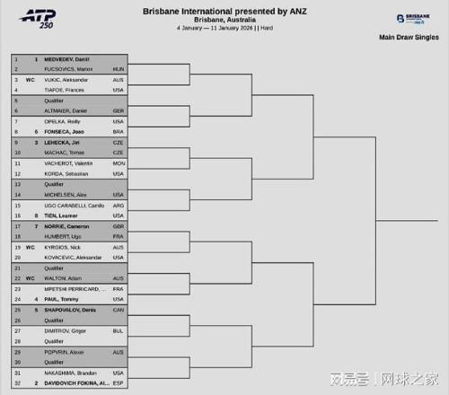 我們?cè)賮黻P(guān)注賽事簽表。北京時(shí)間昨晚,下周開打的三站賽事相繼公布了正賽簽表。其中,ATP250布里斯班站由俄羅斯名將梅德維德夫領(lǐng)銜,西班牙人弗基納、捷克人萊赫卡和美國人保羅分列2-4號(hào)種子;沙波瓦洛夫、豐塞卡等人也將參賽,澳大利亞壞小子克耶高斯持外卡在本站復(fù)出,首輪對(duì)陣美國人科瓦切維奇;梅總和椰子分處上下半?yún)^(qū),如想交手,必須各自打進(jìn)決賽。