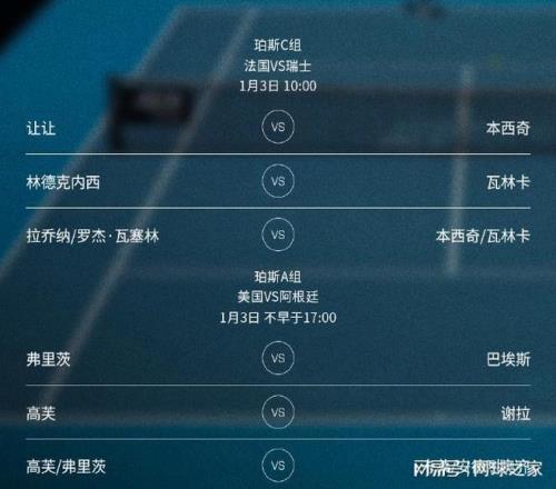 珀斯賽區(qū)的法國隊(duì)與瑞士隊(duì)的較量在北京時(shí)間今天上午10點(diǎn)打響,雙方的對(duì)陣是:讓讓 vs 本西奇、林德克內(nèi)西 vs 瓦林卡、拉喬納/羅杰-瓦塞林 vs 本西奇/瓦林卡。截至發(fā)稿時(shí),瑞士隊(duì)依靠本西奇兩盤獲勝,取得1-0的領(lǐng)先。 北京時(shí)間今天下午2點(diǎn)半和5點(diǎn)時(shí)段,還有澳大利亞vs 挪威和美國vs 阿根廷兩場(chǎng)較量,其中小野兔對(duì)決魯?shù)?、弗里茨PK巴埃斯、高芙對(duì)陣謝拉等場(chǎng)次引人關(guān)注。
