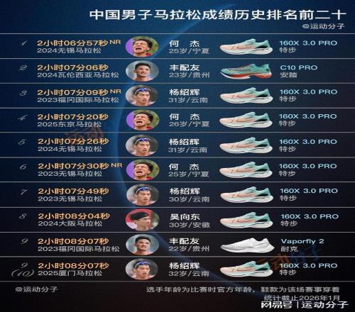 ——何杰、豐配友、楊紹輝、吳向東、陳天宇、董國建、賈俄仁加這些現(xiàn)役選手都趕上了超級跑鞋時代,成績也都由碳板競速鞋創(chuàng)造。