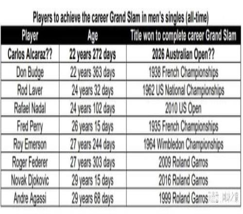 換句話說(shuō),阿爾卡拉斯只要再拿下澳網(wǎng)冠軍,就能完成 “職業(yè)生涯全滿貫”,就算放眼整個(gè)公開(kāi)年代,這項(xiàng)成就也僅為極少數(shù)頂尖選手所專屬。數(shù)據(jù)足以說(shuō)明一切:公開(kāi)賽時(shí)代僅有 5 位球員達(dá)成這一成就,分別是羅德?拉沃爾、阿加西、費(fèi)德勒、納達(dá)爾和德約科維奇。